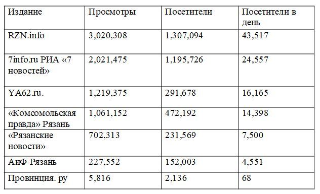 Многие СМИ Рязанской области скрывают свои счётчики, поэтому получить информацию об их посещаемости невозможно. Если их счётчики в будущем будут открыты, таблица дополнится.