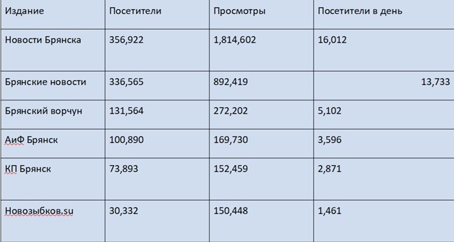 Положительную динамику за месяц больше других продемонстрировало издание «АиФ Брянск», поднявшись на две строчки вверх. Таким образом расстановка в рейтинге за месяц немного изменилась.