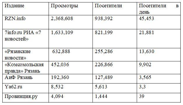 Многие СМИ Рязанской области скрывают свои счётчики, поэтому получить информацию об их посещаемости невозможно. Если ихсчётчики в будущем будут открыты, таблица дополнится.