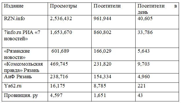 Многие СМИ Рязанской области скрывают свои счётчики, поэтому получить информацию об их посещаемости невозможно. Если ихсчётчики в будущем будут открыты, таблица дополнится.