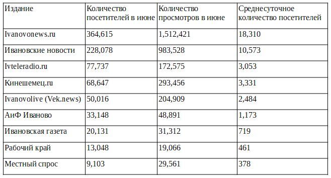 По итогам июня сетевые издания Ivanovonews и «Кинешемец.ru» прибавили по одной позиции.