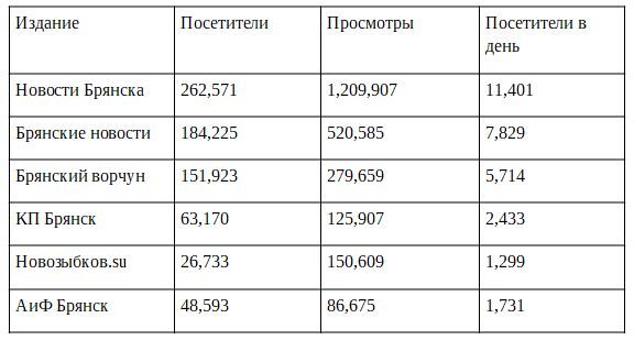Положительную динамику за месяц не продемонстрировали издания «Брянские новости», «КП Брянск» и «АиФ Брянск». Расстановка в рейтинге за месяц немного изменилась. Сайт «Новозыбков.su" обогнал «КП Брянск».