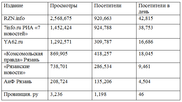 Многие СМИ Рязанской области скрывают свои счётчики, поэтому получить информацию об их посещаемости невозможно. Если их счётчики в будущем будут открыты, таблица дополнится.