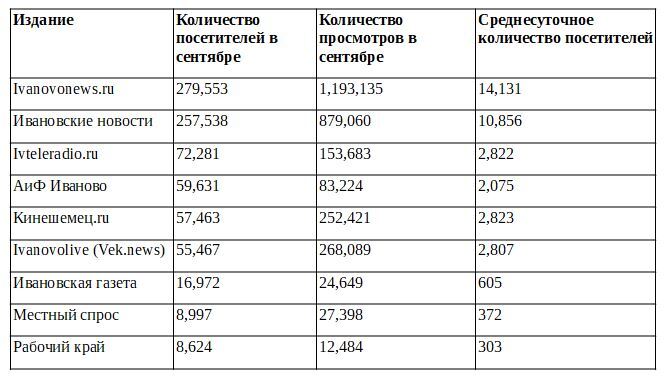 По итогам сентября поднялись издания «Кинешемец.ru» и «Местный спрос».
