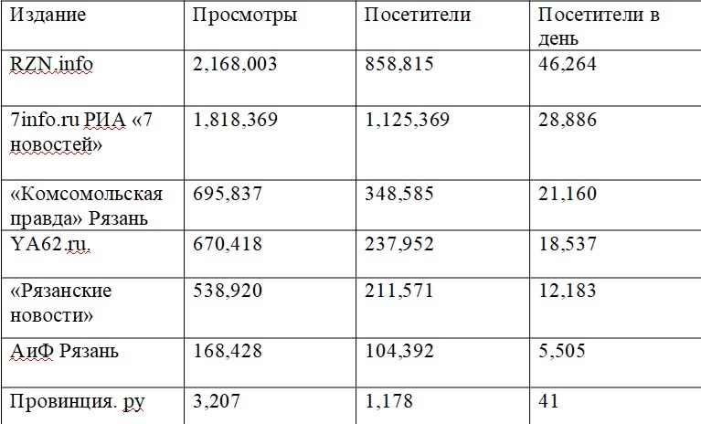 Многие СМИ Рязанской области скрывают свои счётчики, поэтому получить информацию об их посещаемости невозможно. Если их счётчики в будущем будут открыты, таблица дополнится.