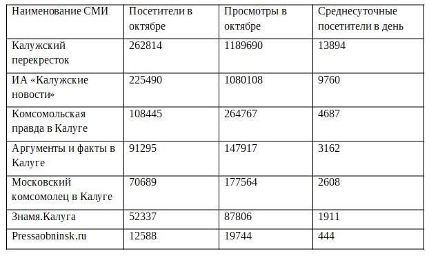 Следует отметить, что некоторые СМИ не представлены в таблице, поскольку скрывают свои счетчики посещаемости.