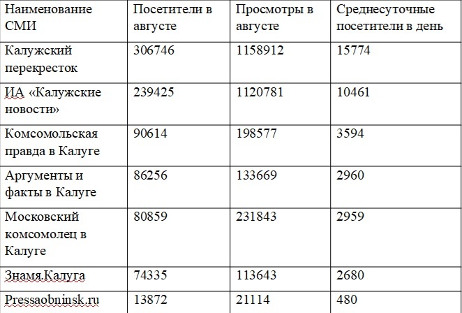 По итогам августа 2025 года среди электронных СМИ Калужской области произошло сразу две ротации. На две позиции вверх вырвалась «Комсомольская Правда в Калуге». На одну строчку вверх также поднялись «Аргументы и Факты в Калуге». Это все привело к тому, что на две позиции вниз по количеству уникальных посетителей на сайте упало издание «Московский Комсомолец в Калуге».