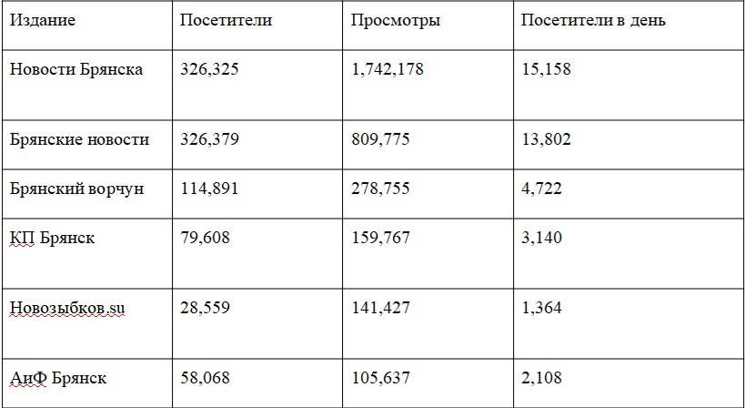 При этом ряд СМИ Брянской области скрывают свои счетчики, потому получить информацию об их посещаемости невозможно. Так, свою статистику скрывают сайты телеканала «Брянская губерния» и РИА «Стрела», курируемые региональным правительством. Счетчик не раскрывает и издание «БрянскToday». Скрыл данные и сайт НАШ Брянск.ru. Если их счетчики в будущем откроют, таблица дополнится.