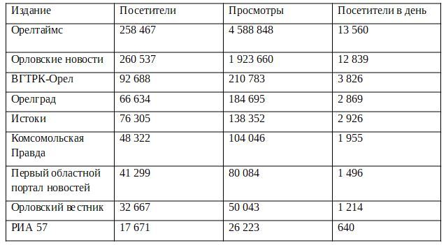 Места в рейтинге распределялись по количеству просмотров за месяц. Почти все региональные СМИ сохранили свои места. При этом «Орловские новости» немного прибавили в просмотрах.