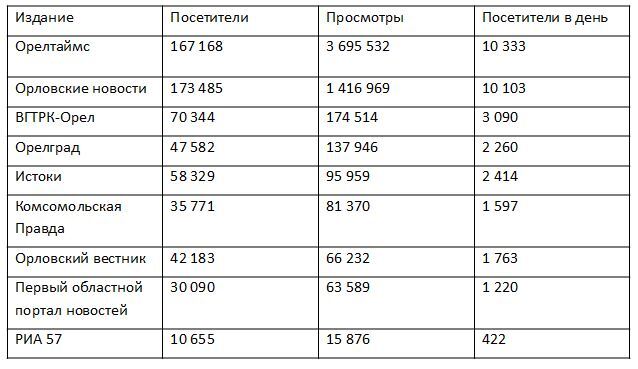 Ассоциация новостных сайтов составляет рейтинги электронных СМИ в регионах партнерах. Подготовлен рейтинг электронных СМИ Орловской области за февраль 2026 года. Рейтинг составлен согласно данным ведущего сервиса интернет статистики liveinternet.ru, предоставляющего наиболее понятные и разнообразные инструменты сбора, обработки и последующего анализа данных. Но данный счетчик открыт не у всех СМИ, поэтому в рейтинг включены только те СМИ, чьи данные по счетчику имеется возможность проверить.